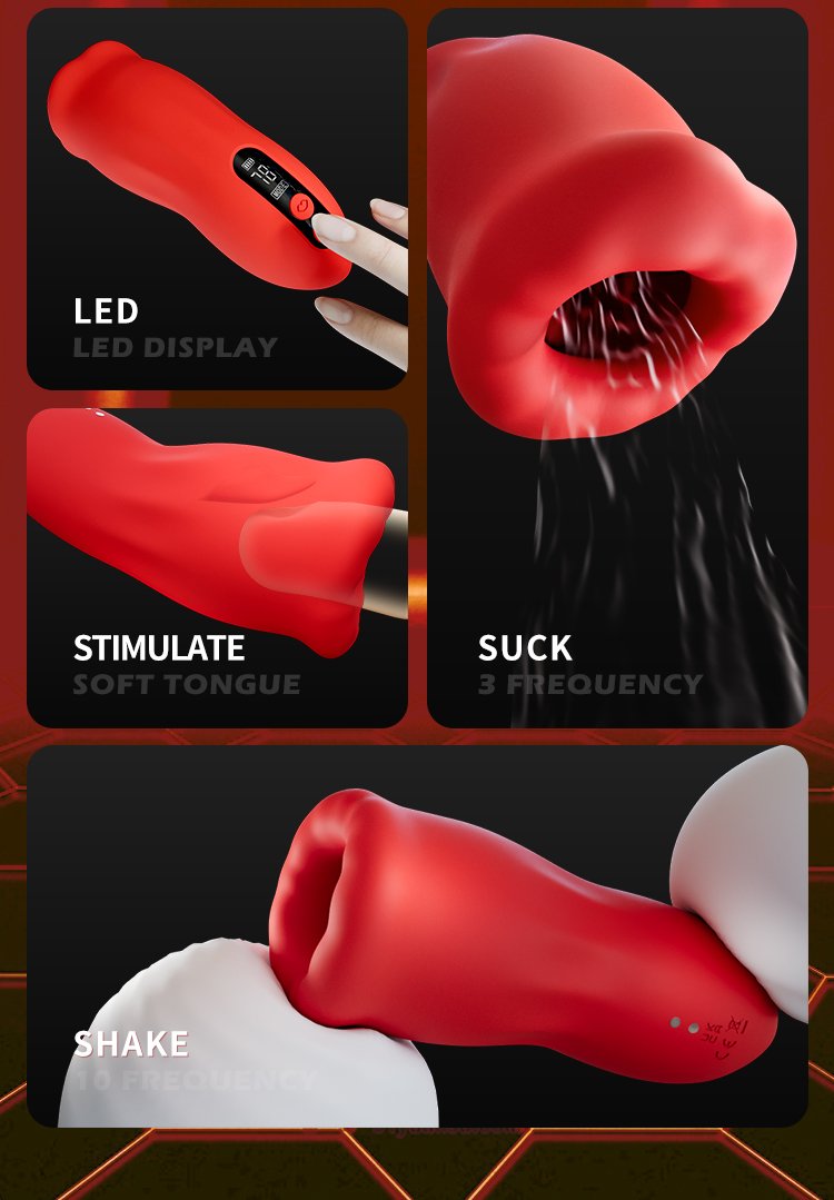 - Suck-Shake Functie: De combinatie van zuigen en trillen (“Suck on the vibration”) zorgt voor een dubbele stimulatie en fysieke training. Het apparaat beschikt over 3 zuigfrequenties en 9 trillingsfrequenties.