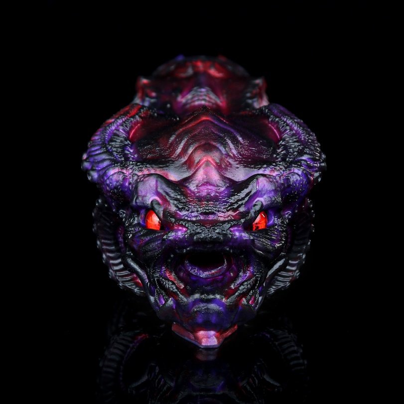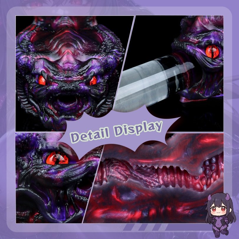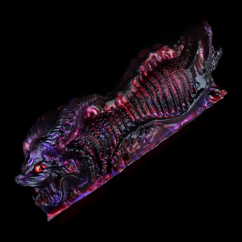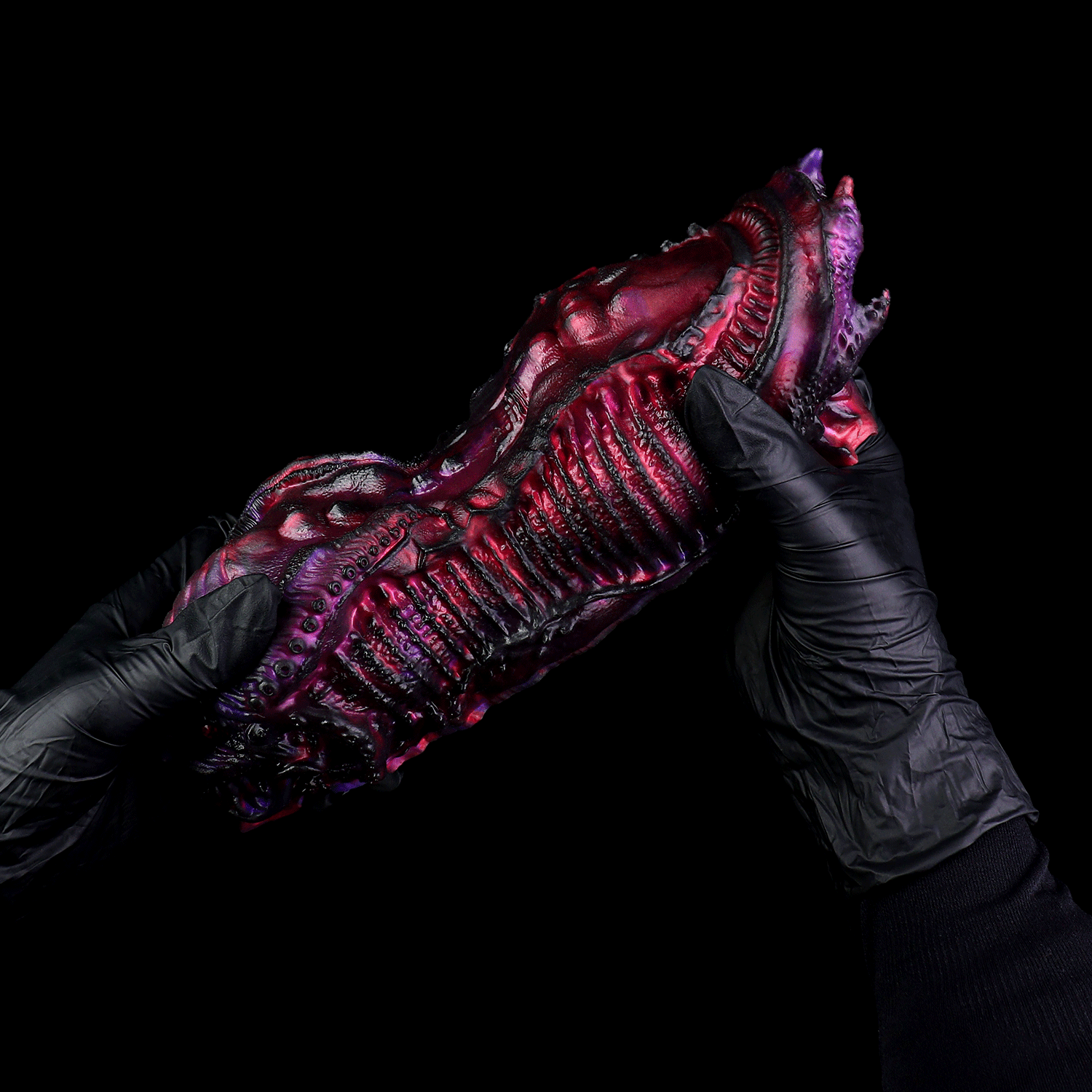 “Het moment dat ik deze pocket pussy oppakte, voelde ik direct het indrukwekkende gewicht van 785 gram; dit is geen lichtgewicht speelgoedje, maar een serieuze toevoeging aan mijn fetishes collectie. De donkere, paars-rode schubben glinsterden, en de angstaanjagende bek met rode ogen staarde me uitnodigend aan.
