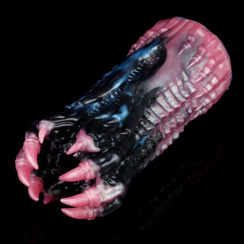 - Het Uiterlijk: De buitenkant is een mix van metallic roze, zwart en blauw. Het heeft een geschubde structuur die doet denken aan een reptiel of alien. De ingang wordt bewaakt door zachte, roze “klauwen” of tanden. Dit ziet er intimiderend uit, maar voelt geweldig.
