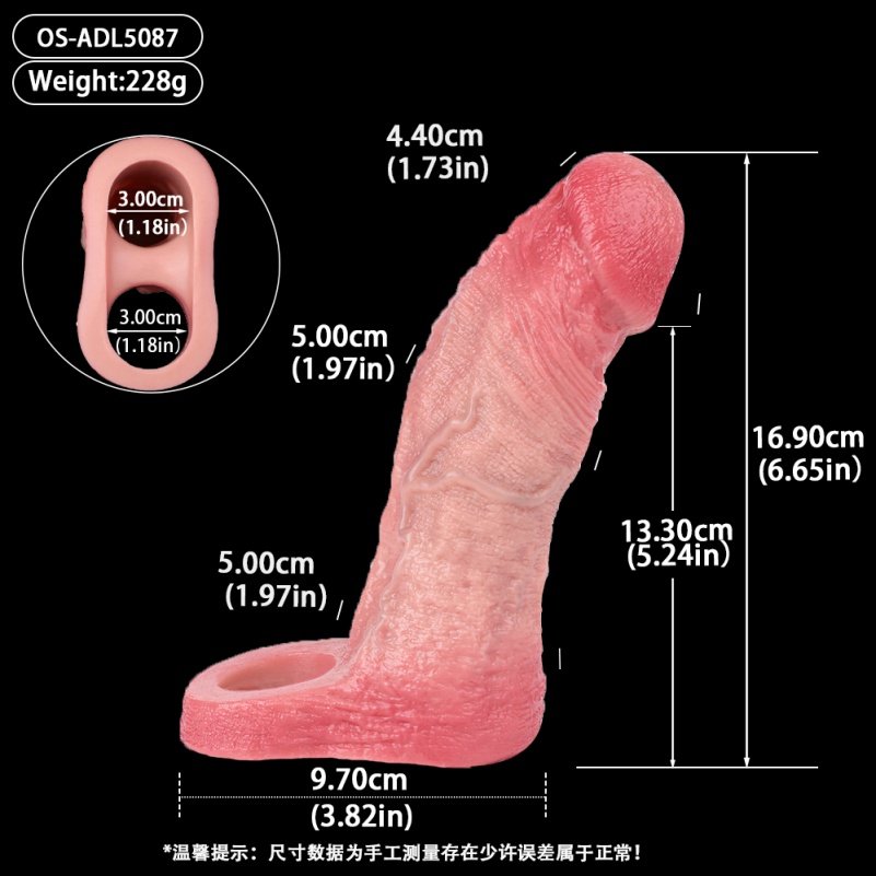 Deze penis sheath is ontworpen om een realistische en comfortabele pasvorm te bieden. Het materiaal heeft een vleesachtige textuur en een subtiele glans, die de uitstraling en het gevoel van echte huid imiteert. De gedetailleerde aderen geven het een extra realistische look. Dankzij het rekbare ontwerp kan het zich aanpassen aan verschillende maten en blijft het goed op zijn plaats, zonder te verschuiven.