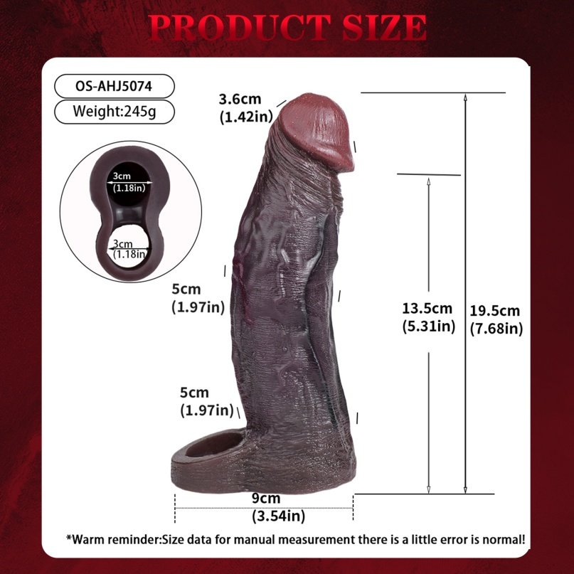 De sleeve is gemaakt van rekbaar siliconenmateriaal. Hij past om de meeste penises. De bal-lus zorgt ervoor dat hij stevig op zijn plek blijft, ongeacht uw oorspronkelijke omvang.