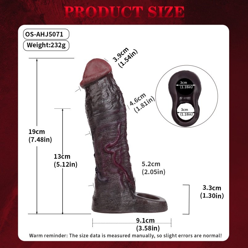 • Verlenging en Verdikking: Zoals de afbeeldingen tonen, maakt deze sleeve je lid aanzienlijk groter en dikker in vergelijking met een standaard stijve penis of dildo. Het is de ideale oplossing voor mannen met een micropenis of een klein piemeltje die meer volume wensen.